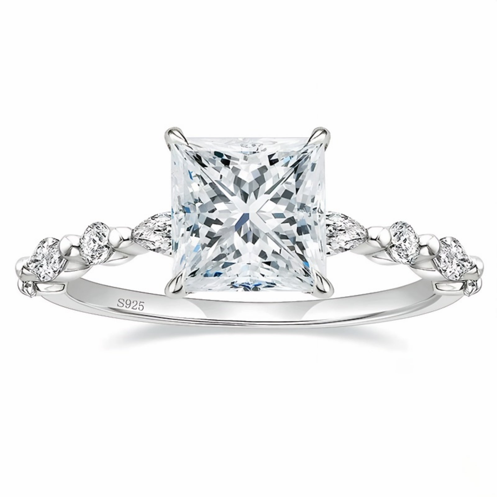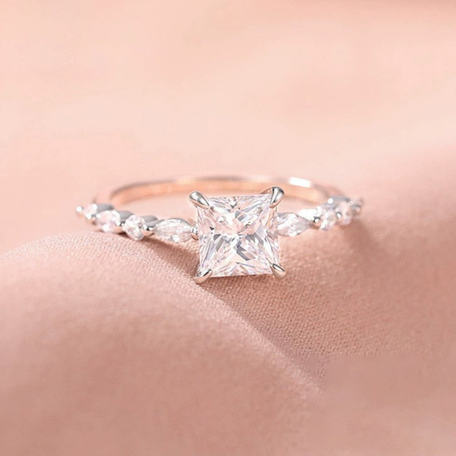 - 【Classical Design & Comfortable】This Engagement ring is perfect addition to any jewelry collection,the most classic design and it will never go out of style.The metal of the ring is sterling silver, which is 100% Hypoallergenic, Lead-free & Nickel-free. And the edges are smooth,will not caught skin or clothes.The main stone is a princess cut, and the band is elegantly embellished with multiple gemstones, adding a touch of genuine emotion to the ring.